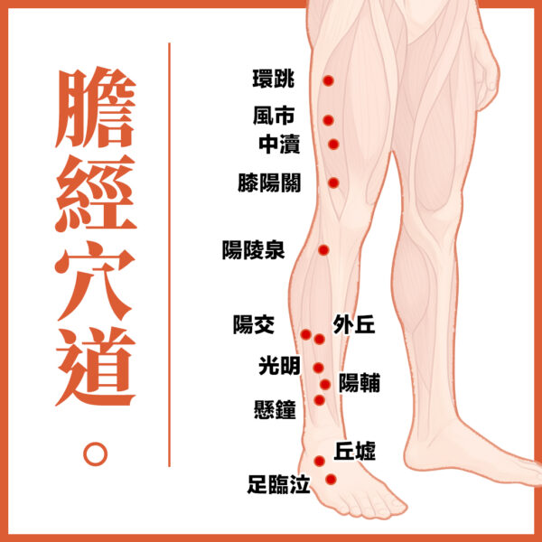 若以腿部為主來看,膽筋主要位於下半身外側路徑,用手壓下去會有微微痠脹感的位置,可用以下方式確認: