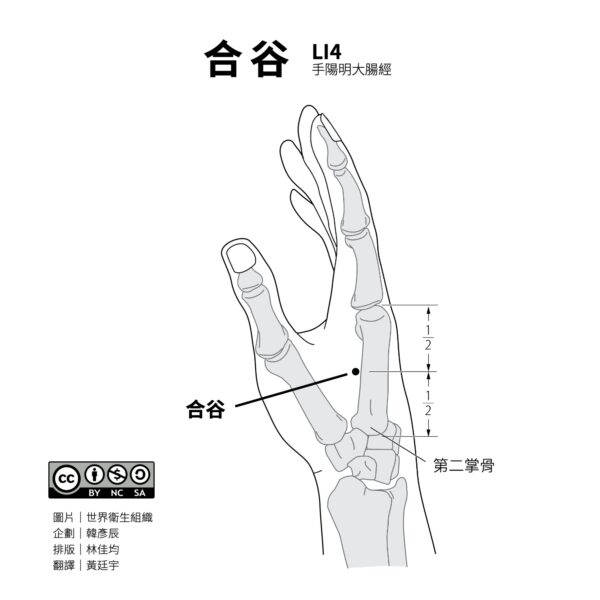 可先雙手互搓至發熱,促進局部循環後再開始按壓。使用拇指或食指關節按壓合谷穴,緩慢加壓至有痠脹感,再搭配畫圈按揉法:以拇指輕柔畫圓 1 分鐘,可幫助放鬆頭頸部肌肉、改善氣血循環。