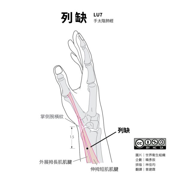 穴位位置:列缺穴位於前臂橈側,當兩手交叉時,一手食指正好搭在另一手腕上,食指尖所指處,即為列缺穴。