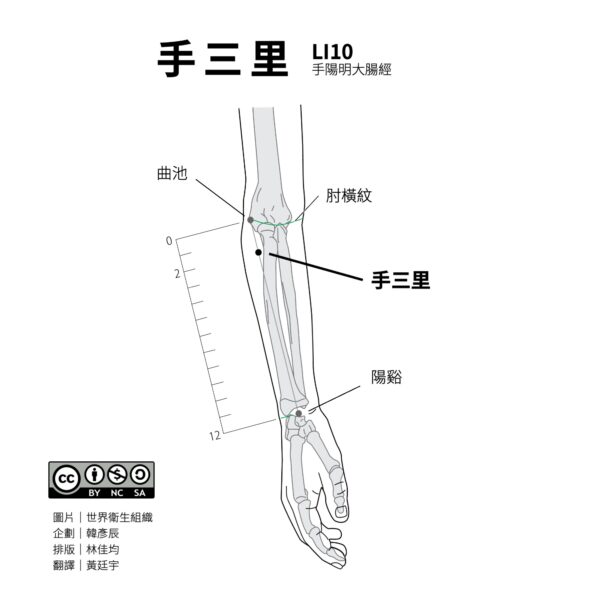 手三里穴穴位位置:手三里穴位於前臂外側,沿著前臂肌肉向下摸約三指幅度,肌肉隆起旁的壓痛點,即是手三里穴。