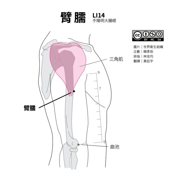 臂臑穴穴位位置:臂臑穴位於手自然下垂,用另一手沿著肩膀外側往下摸,找到上臂外側一個微凹、按壓會痠脹的點,就是臂臑穴。
