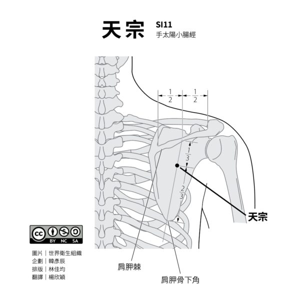 天宗穴穴位位置:天宗穴位於肩胛骨中央偏內側的凹陷處,可先摸到肩胛骨的輪廓,將手放在肩胛骨正中間,當按到一個痠脹、有深層卡感的位置,即為天宗穴。