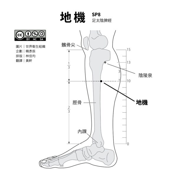 地機穴穴位位置:地機穴位於小腿內側,從膝蓋內側往下約三橫指處,靠近脛骨內側後方的凹陷處。觸壓時會有明顯痠脹感,即為地機穴。