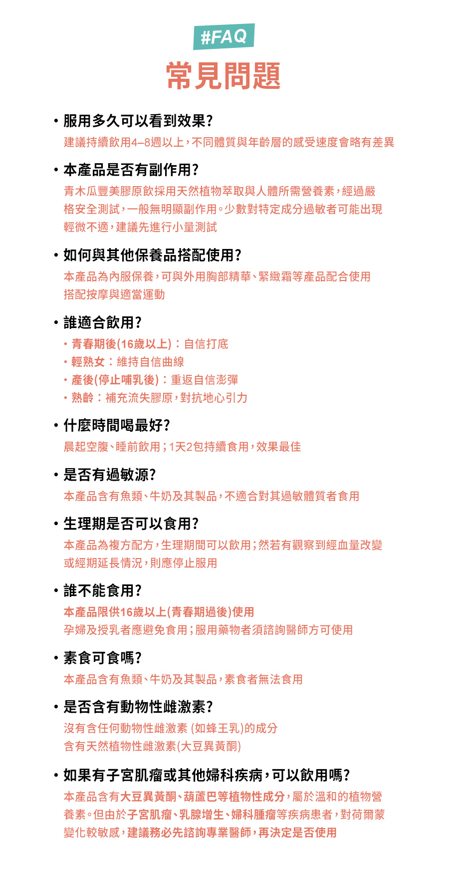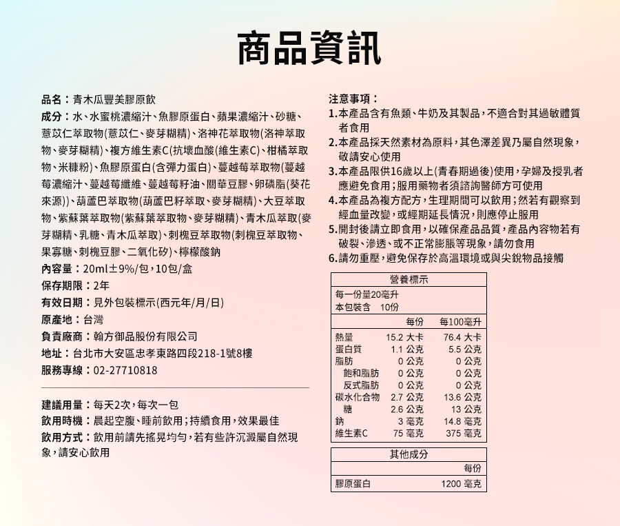 規格:20ml/包;10包/盒 建議:每天早晚各1包 (建議長期持續飲用並搭配按摩感受更佳)