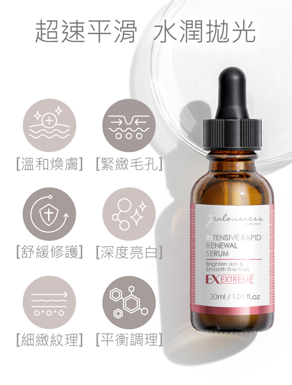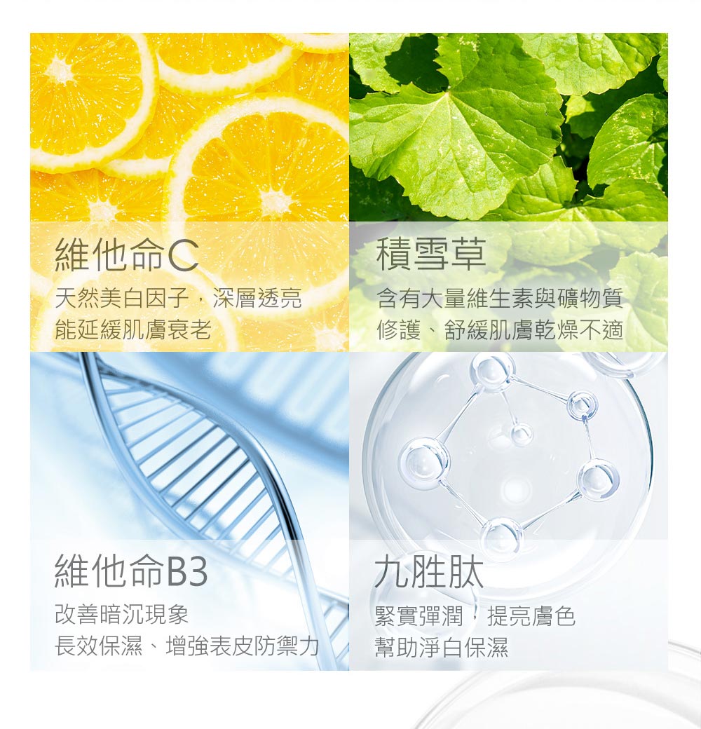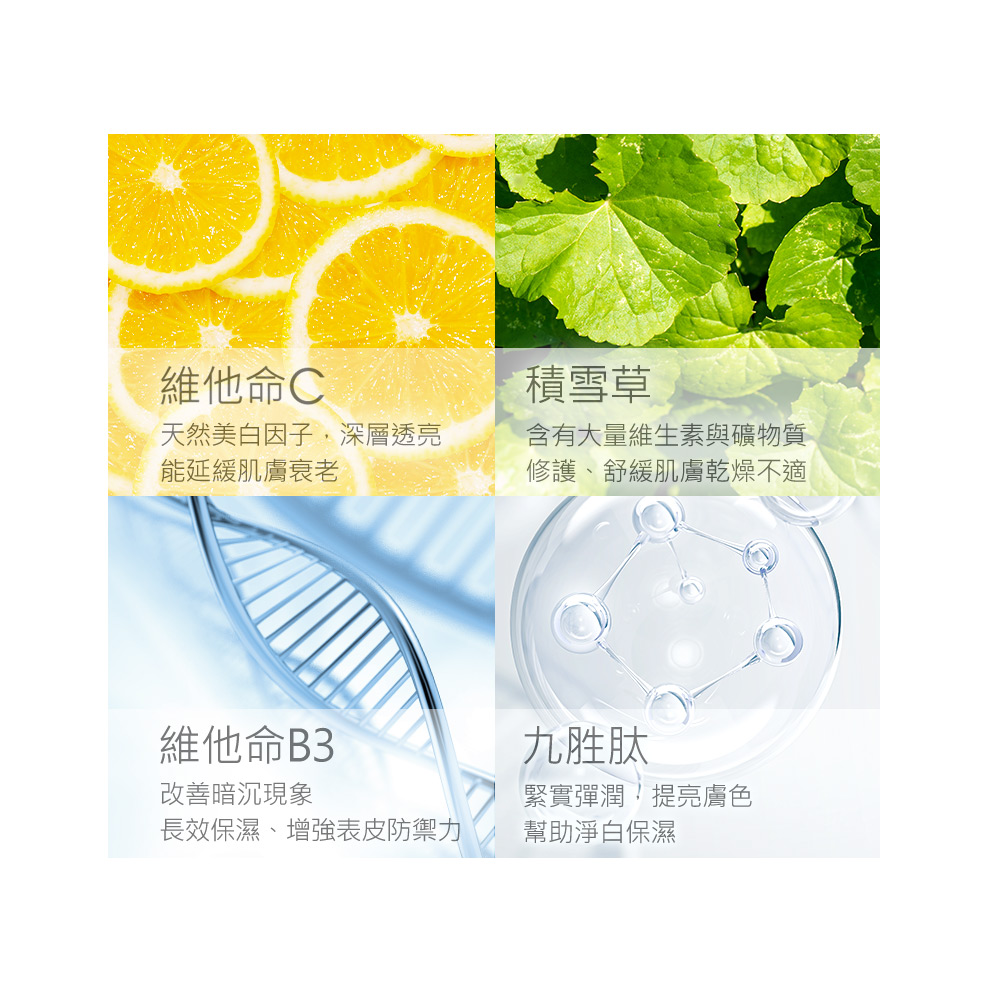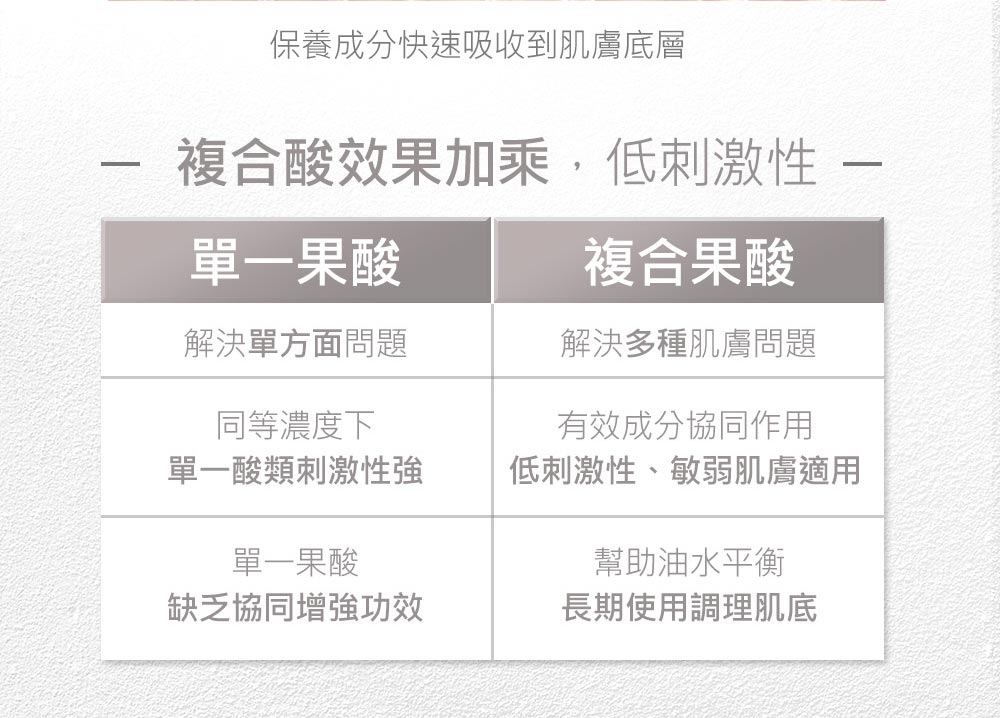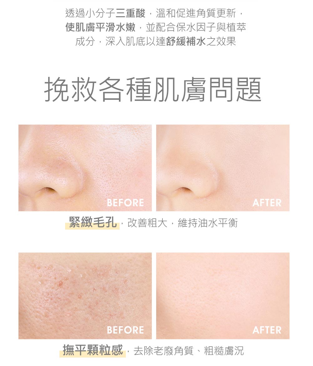 ■黃金比例三重酸淨化毛孔,調理角質,促進其更新代謝 ■溫和煥膚、緊緻平滑、均勻膚色 ■成分:杏仁酸、蘋果酸、甘醇酸、九胜肽、維他命C、維他命B3、積雪草 ■使用方式:化妝水後取適量,均勻塗抹於臉部至完全吸收,尤其加強T字及易出油部位