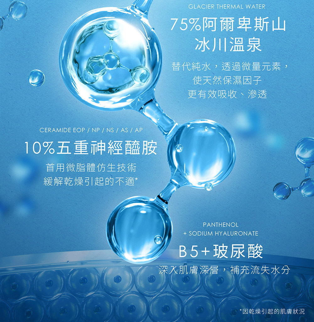 ■高效保濕/修護肌底/細緻彈潤/穩定膚況 ■成分:75%阿爾卑斯山冰川溫泉、10%五重神經醯胺、B5+玻尿酸 ■早晚清潔後,取適量均勻塗抹於臉及頸部肌膚,並輕拍至吸收